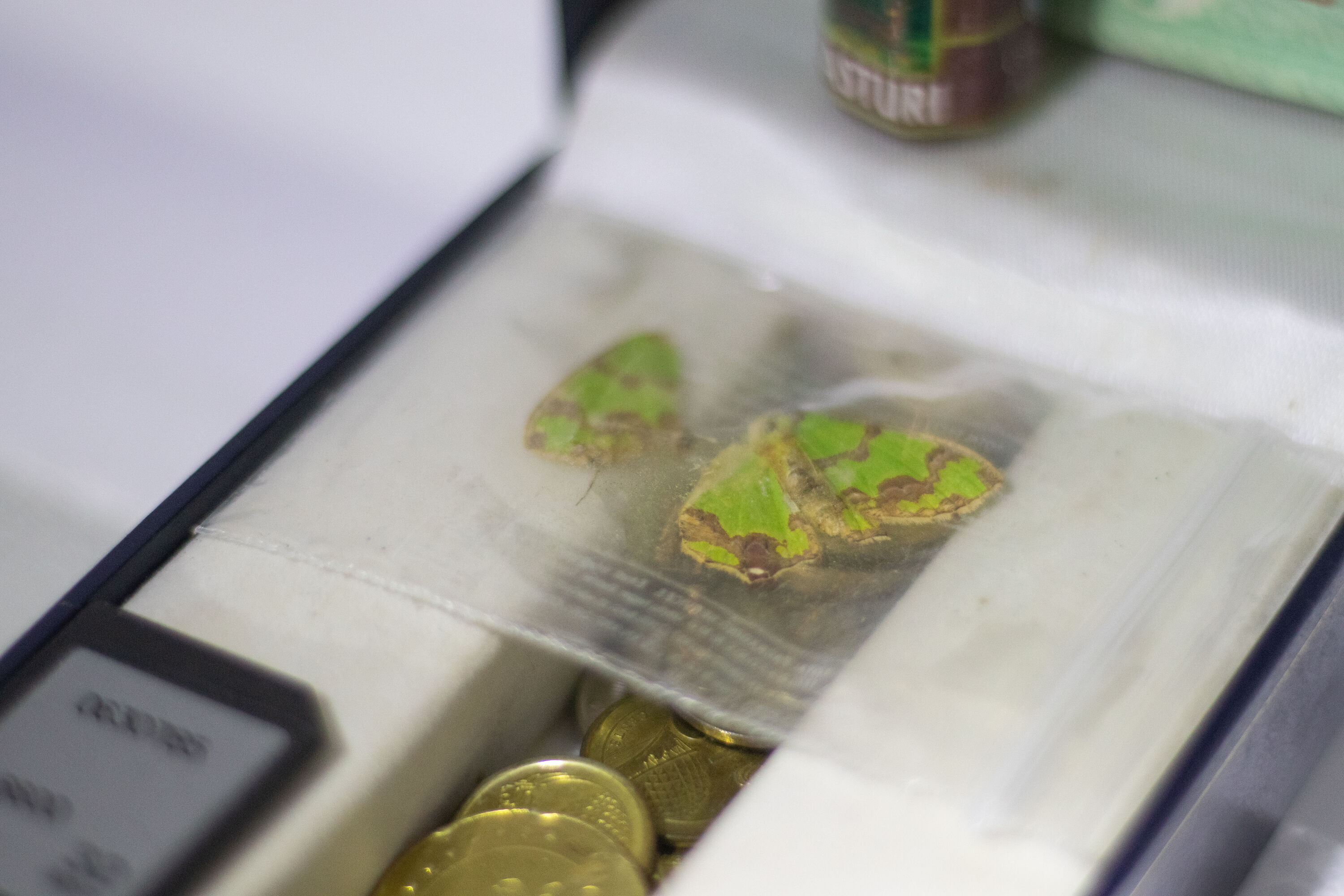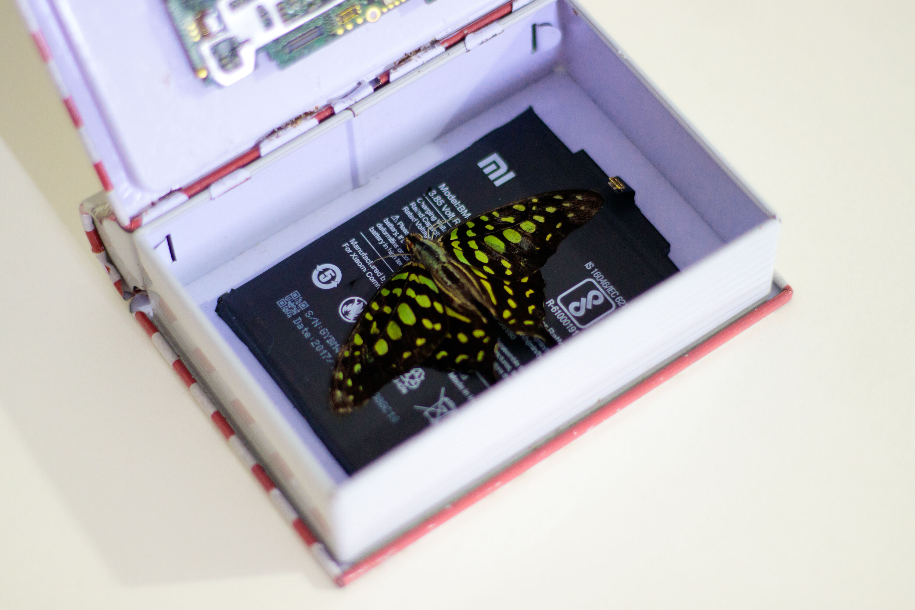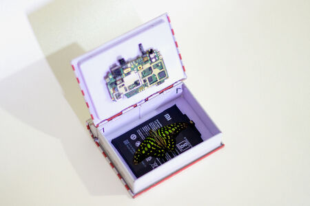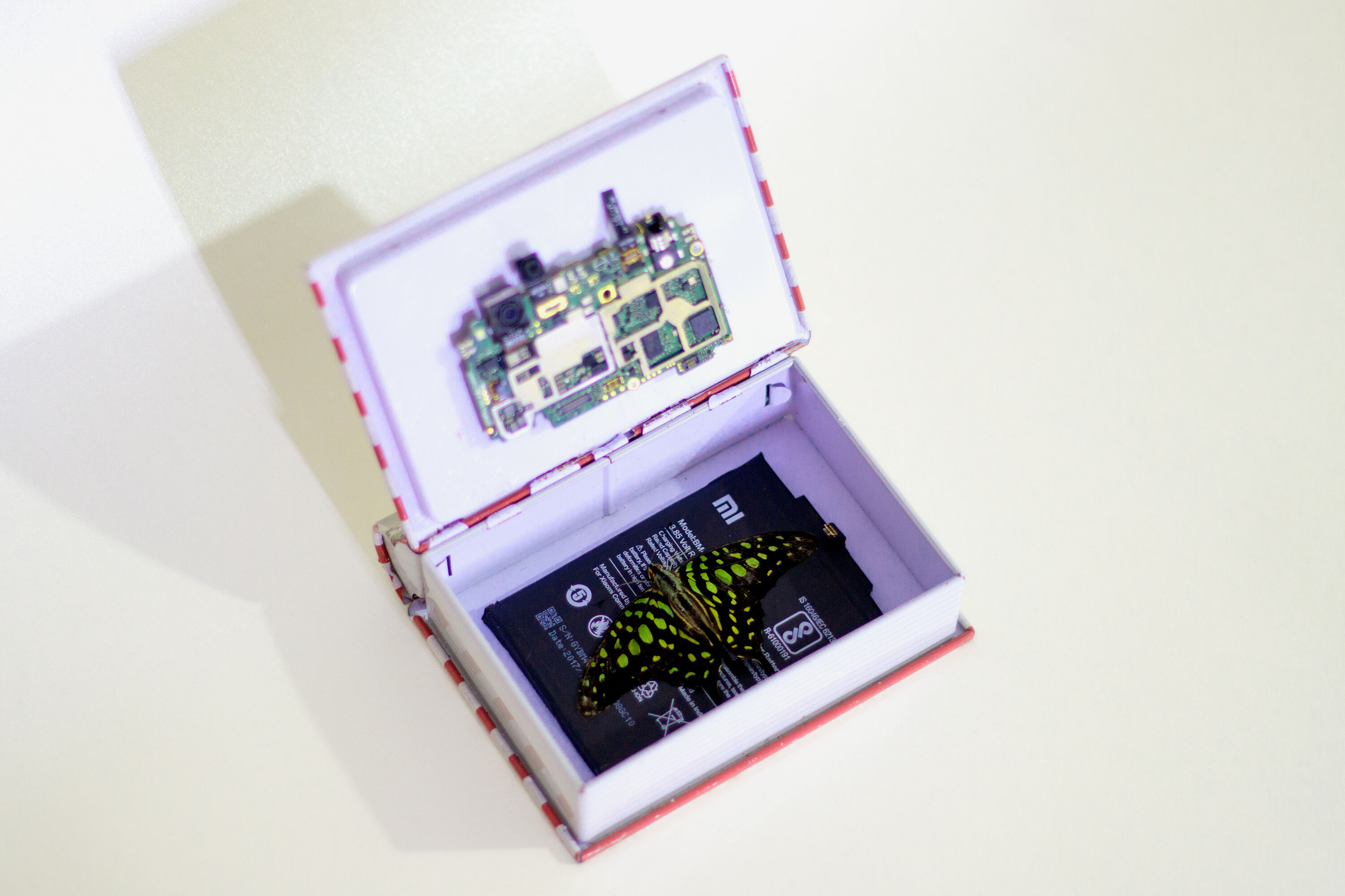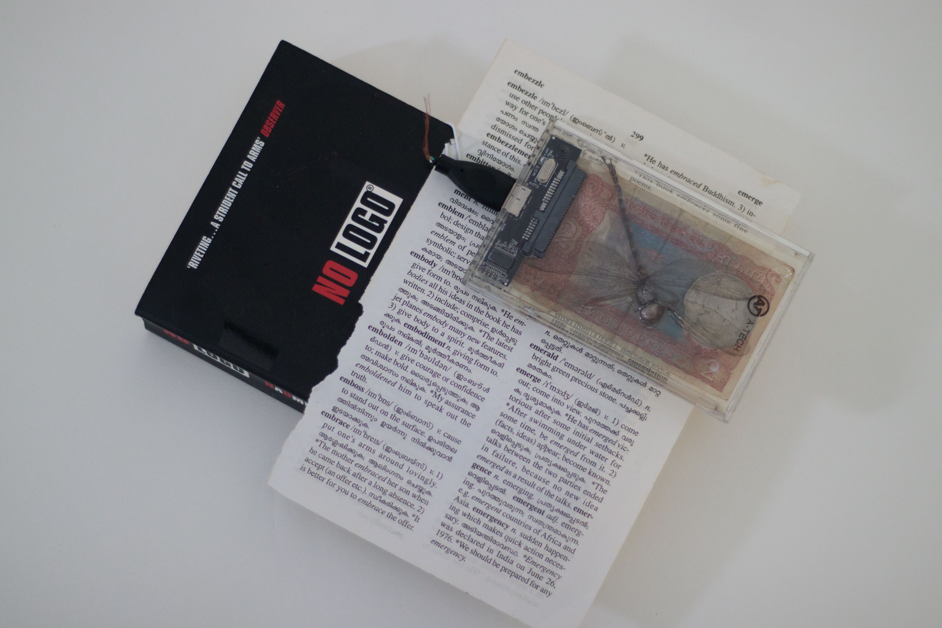 a resin mold consisting of a disabled micro SD card, a moth, a mobile circuit board, a coin featuring Jasmin flower, An Indian postal stamp featuring Bal Gangadhar Tilak, an earring made out of animal bone, a Coin commemorating Jawaharlal Nehru, A crashed pen drive, currency, mushroom, resin